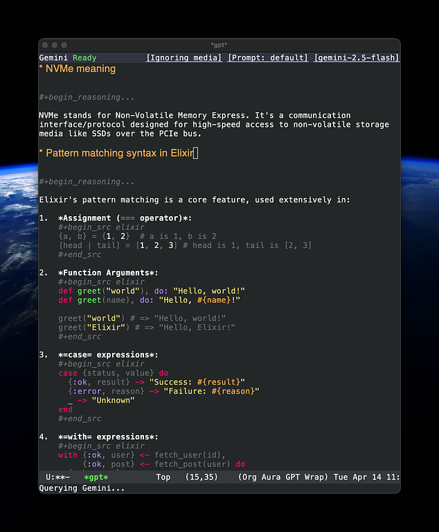 For my use cases, I typically utilize the built-in "M-x gptel" function, which I have hooked up to automatically pop open an org file with Gemini pre-configured. The whole buffer then becomes my chat interface. Here's what this looks like in practice: